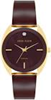 Case: Gold-tone steel case, round, 34mm; Dial: Brown mother-of-pearl dial; Bezel: Brown enamel bezel; Index: Diamond at 12; Band: Gold-tone & brown acetate bangle bracelet; Closure: Jewelry clasp; Water Resistance: 100 ft (30m)