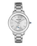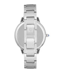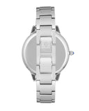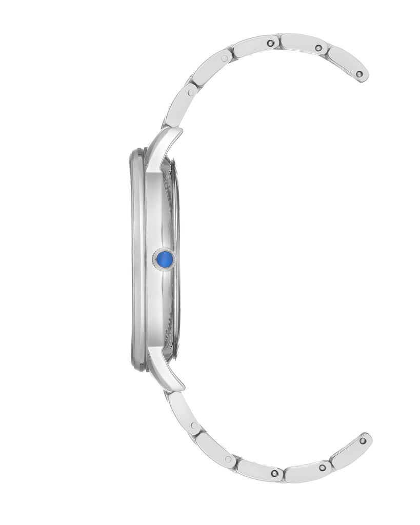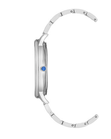 Case: silvertone round (38MM x 44MM); Dial: Silver Sunray; Bezel: ; Index: Sticks; Band: silvertone stainless steel; Closure: Jewelry Clasp; WR: 100 feet