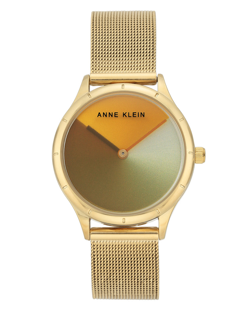 Case: Nickel compliant goldtone round (33.6MM x 33.6MM); Dial: multi color: olive/yellow; Bezel: Goldtone; Band: Nickel compliant goldtone Stainless Steel Mesh; Closure: Adjustable buckle; WR: 100 feet