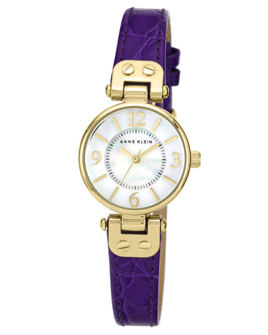 Case: Purple metal case, round, ~30mm; Dial: Purple mother-of-pearl dial; Bezel: Purple fixed bezel, polished; Index: Silver-tone Roman numerals & crystal dot markers; Band: Purple leather strap; Closure: Buckle clasp; Water Resistance: 100 ft (30m)