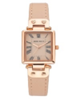 Case: Nickel compliant rose gold rectangle (21.5mm x 34.5mm); Dial: Blush mother of pearl; Bezel: rose gold; Index: Roman; Band: Nickel compliant rose gold with blush leather; Closure: ; WR: Splash resistant