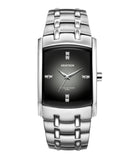 Gents stainless steel sport, 32.5 x 41mm rect case, wall to wall mineral crystal with black silk screened frame, adjustable bracelet with one touch two button fold over clasp, dark gray degrade dial, total 8 genuine crystal markers, sweep second hand, wr 165