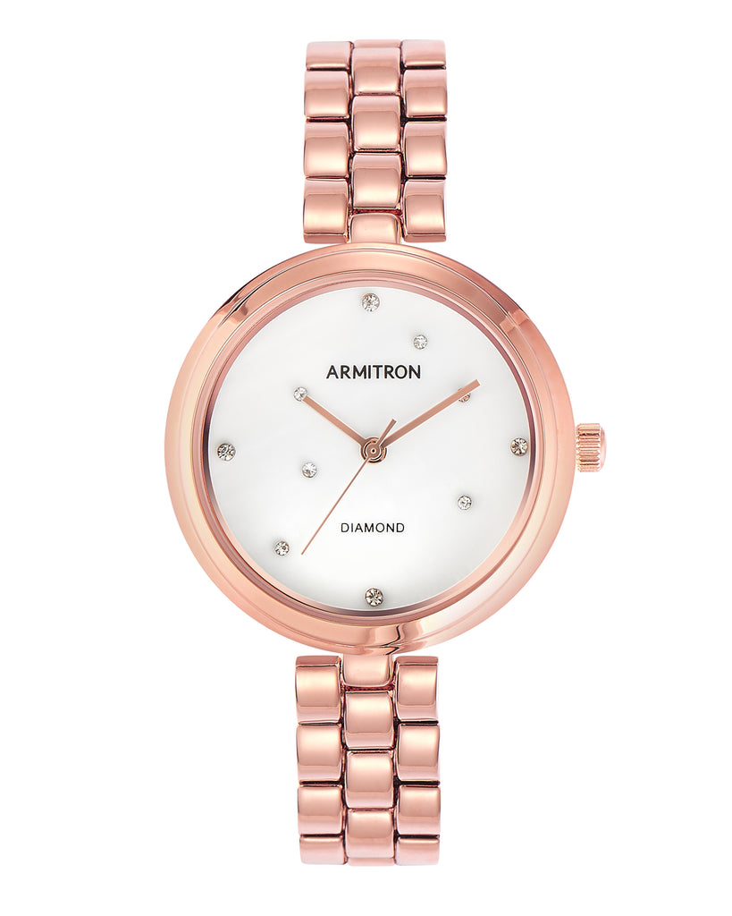 33mm round ip rose gold case with 2-step bezel, mineral lens, ip rose gold adjustable link bracelet with jewelry clasp/extender natural mother of pearl dial w/total 12 genuine diamonds, rose gold hands and stick sweep, wr 165ft