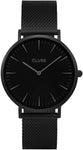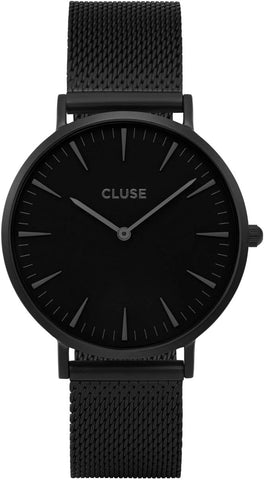 The CLUSE CL18111 is a stylish women's watch from the collection, designed with a sleek, modern aesthetic. Featuring a round stainless steel case measuring 38 mm in diameter and 7 mm in thickness, it offers a small, elegant profile. The black dial is protected by a durable mineral crystal and showcases an analog display. Its matching black stainless steel mesh band, sized to fit women's standard wrists, is 18 mm wide and secured with a sliding clasp for a comfortable fit. The watch is powered by a reliable quartz movement and is water-resistant up to 3 bar, making it suitable for everyday wear. While it does not include a date function, it comes with a manufacturer warranty and includes essential features like water resistance and a stainless steel bezel, making it a great combination of form and function.