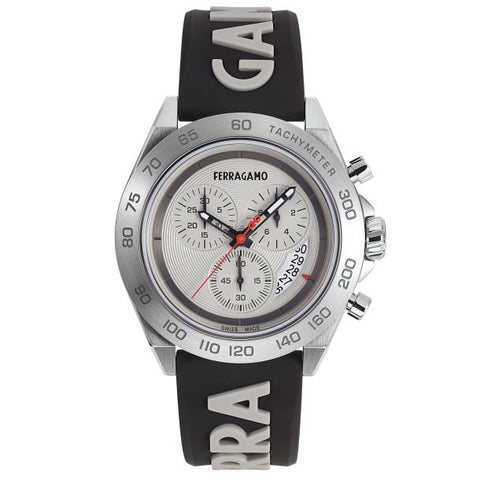 Playful, contemporary and dynamic. The new Ferragamo Urban Chrono is inspired by the Maison’s collections, a watch that combines refined details with young aesthetics. The new Ferragamo lettering on the grey guilloché dial underlines the character of identity of this mode and is reaffirmed on the black silicone strap by the embossed Ferragamo lettering. Perfect to complete a young, dynamic style, Ferragamo Urban is the reinterpretation of a best-selling collection that targets new generations. 43mm stainless steel case with a tachymeter bezel Grey guilloché dial with a date window at 4 o’clock and luminous accents Black silicone strap with a deployant buckle Swiss-made 6-hand quartz chronograph movement Water-resistant up to 5 ATM (50 meters)