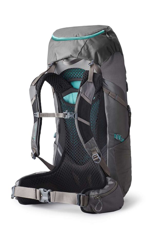 The Gregory Jade 53 in Mist Grey is a womens-specific backpack designed for weekend excursions, offering a combination of comfort, functionality, and eco-friendly materials. Its FreeFloat dynamic suspension system features an adjustable torso length and a flexible, cushioned hipbelt that conforms to your lower back and hips, moving naturally with your body to support the packs weight. The tensioned mesh back panel creates an open space between your back and the pack, maximizing ventilation and keeping you cool on the trail. With a 53-liter capacity, the Jade 53 provides ample space for your gear, and the unique front U-zip opening allows easy access to the main compartment. Additional features include extra-large hipbelt pockets for secure storage of essentials, a zippered bottom sleeping bag compartment with a removable divider, and a raincover included in a dedicated zippered pocket for added organization. Constructed from eco-friendly materials, this backpack is both durable and sustainable, making it a must-have for your outdoor adventures.