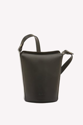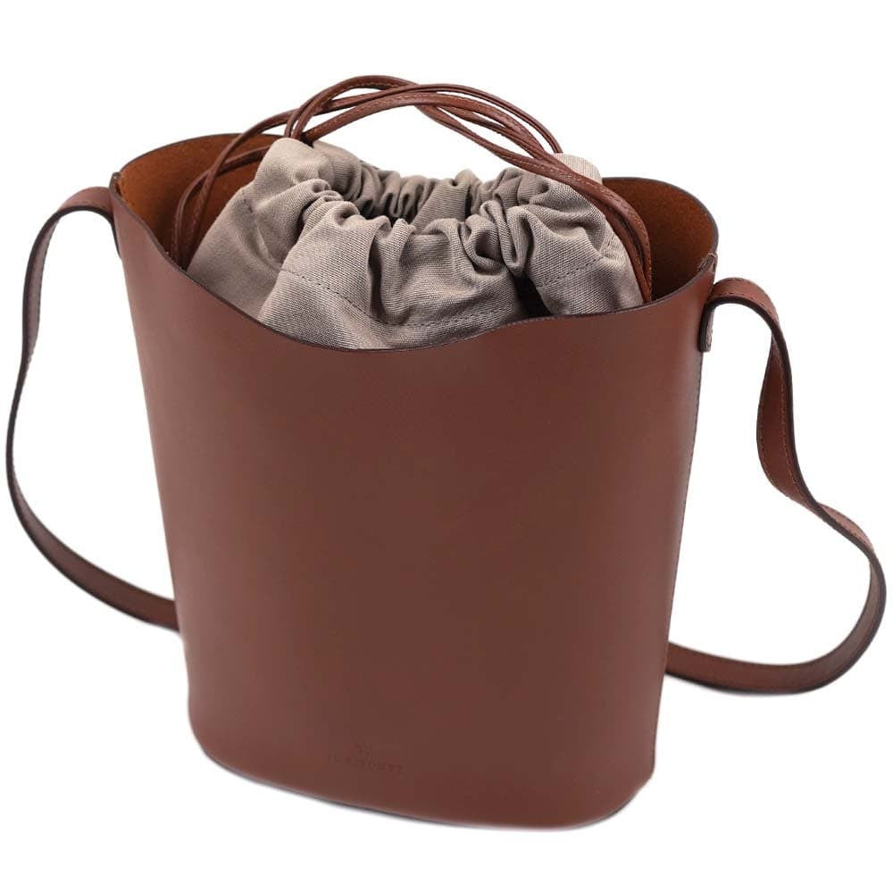 The Il Bisonte Bucket Maggio Bag is a sculptural and elegant shoulder bag handcrafted in Tuscany, Italy, from 100% vegetable-tanned cowhide leather in a sleek and timeless black tone. Designed with a rounded structure formed on a beech wood frame, the top folds naturally and stays securely closed with hidden magnetic fastenings, preserving the bag’s clean silhouette. The shoulder strap is seamlessly integrated into the contour of the bag for a minimalist finish. Unlined and accented with brass hardware, it measures approximately 20 × 16 × 23 cm—a distinctive and functional piece that embodies Il Bisonte’s heritage of Italian craftsmanship.