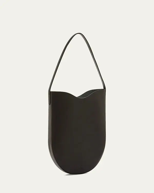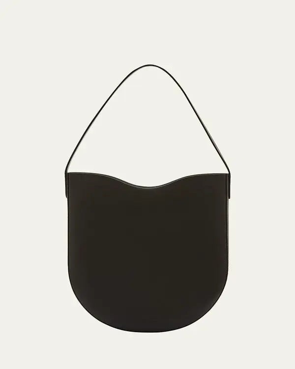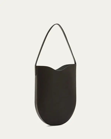 The Il Bisonte Roseto Hobo Bag (BHO001PV0041 BK252) is a medium-sized tote handcrafted in Italy from luxurious vegetable-tanned Vacchetta leather, presented in timeless black (BK252). Its sleek silhouette features Il Bisonte’s signature wave contour, a flat leather shoulder strap with a comfortable 10.2-inch drop, and a secure magnetic closure for easy access. The minimalist design is unlined, highlighting the natural beauty of the leather, and includes a single interior slip pocket for essentials. Measuring approx. 14.6" (H) × 13" (W) × 2.4" (D), this versatile tote pairs effortlessly with everyday or occasion wear, reflecting Il Bisonte’s commitment to craftsmanship, elegance, and lasting quality.