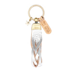 The IL BISONTE Saturnia keyring in metallic silver is crafted from high-quality metallic leather and finished with durable brass hardware. With its sleek and refined design, this accessory measures 2 × 12 × 3 cm, offering a stylish and practical touch to your everyday carry. Made in Italy.