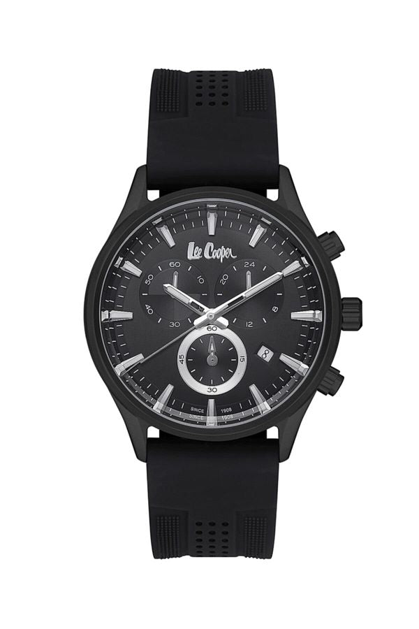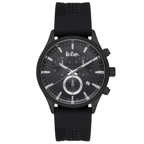 Gender: Men's; Collection: Sports Series; Diameter: 44 mm; Case material: Stainless Steel; Case color: Silver; Dial color: Black; Index: Markers (Full); Band material: Silicone; Band color: Blue; Closure: Buckle; Water resistance: 100 meters; Glass: Mineral Glass.