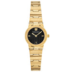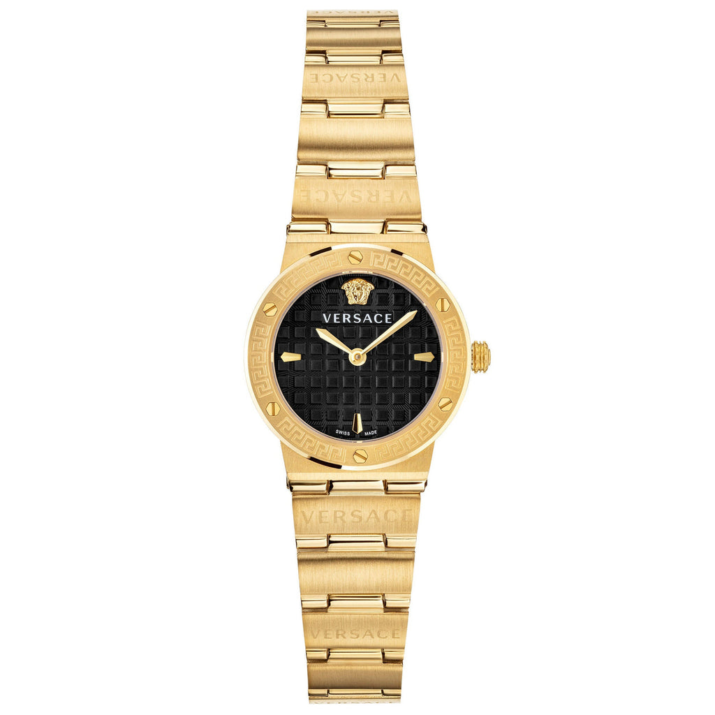 A contemporary timepiece combining geometric shapes and feminine style, Greca Logo features a miniature and round-shaped case that stands in contrast with the rectangular bracelet links. The top ring is marked by the screws and the Greca motif, which gives an immediate recognition of the Brand reinforced by the Versace logo and a three-dimensional Medusa at 12 o’clock. In the bracelet version, the timepieces sleek design is completed by the Versace logo alternately repeated on the links.